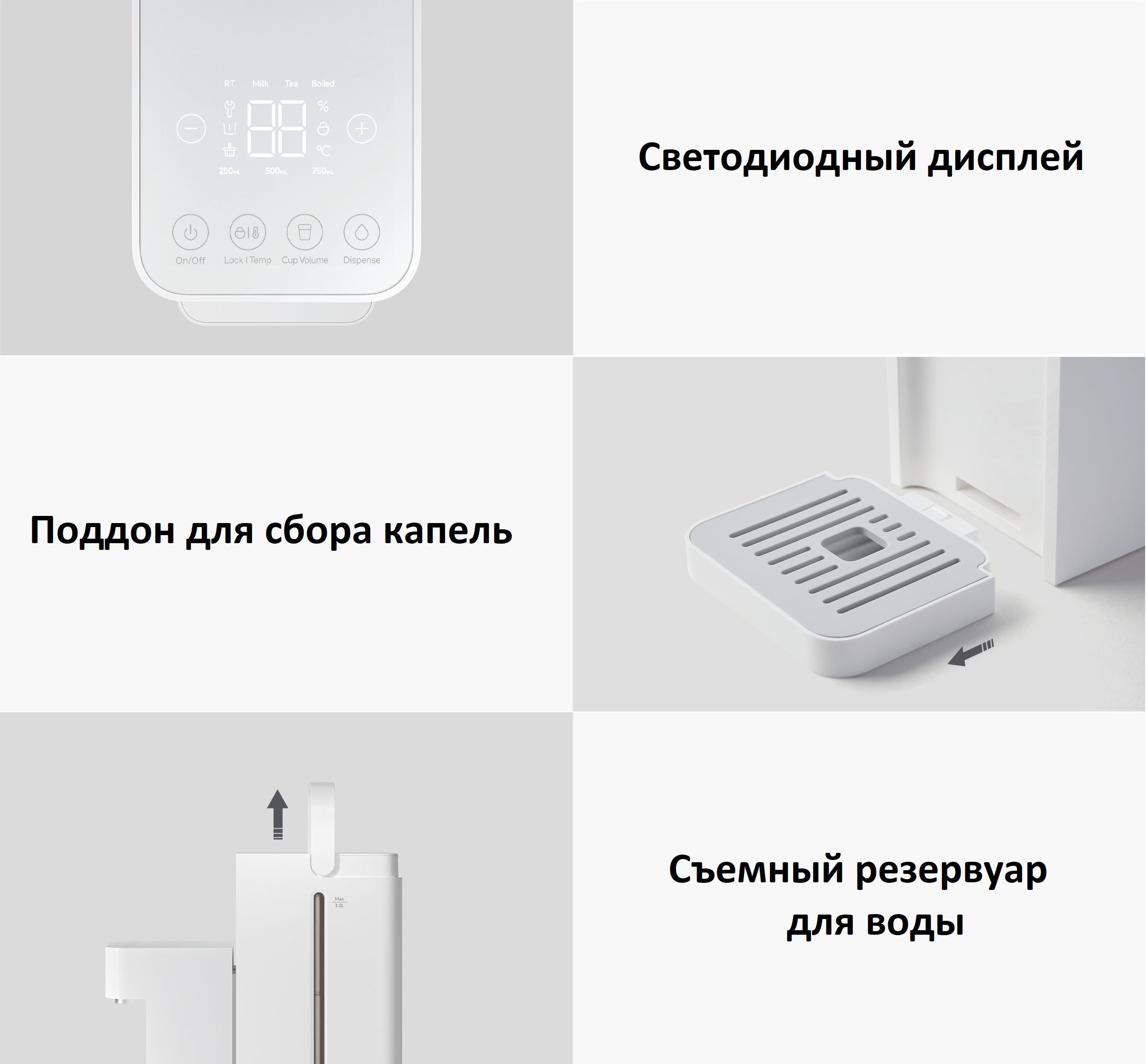 Особенности 4 уровня температуры, 3 уровня выдачи воды (250 мл, 500 мл или 750 мл), блокировка от детей, светодиодный дисплей, нагрев от 45° до 95° с шагом в 1°, сенсорное управление, съемный резервуар для воды