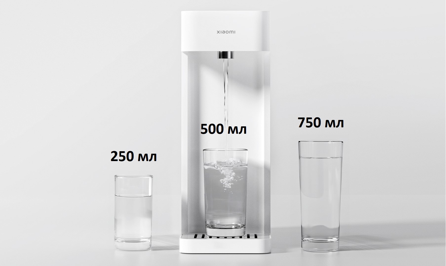 При наборе воды пользователь может выбрать один из 3 размеров стакана – 250, 500 или 750 мл.