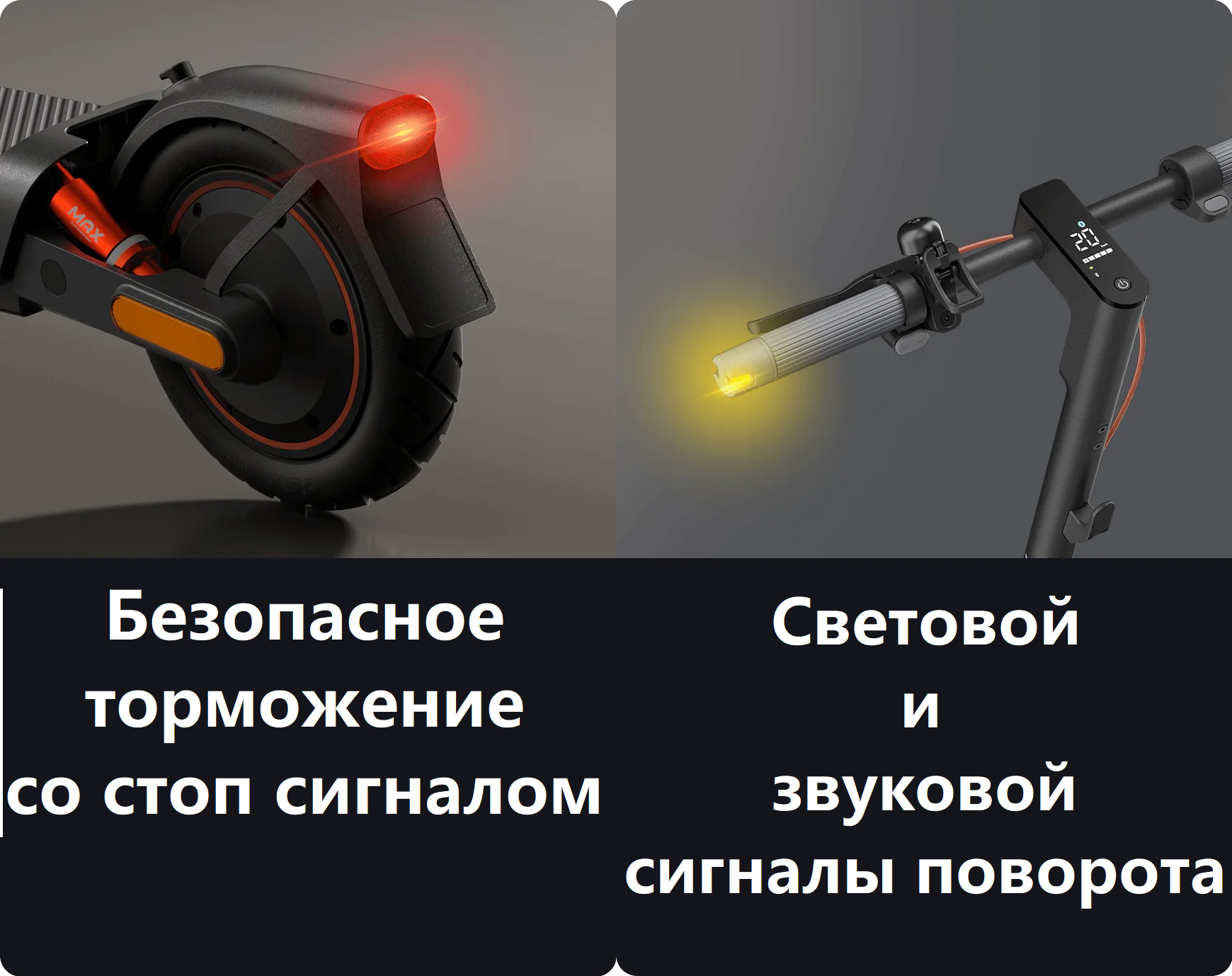Электросамокат оснащен механическим барабанным тормозом на переднем колесе и электрическим тормозом E-ABS на заднем. Они работают вместе, чтобы значительно сократить тормозной путь, повышая устойчивость и безопасность на дороге.