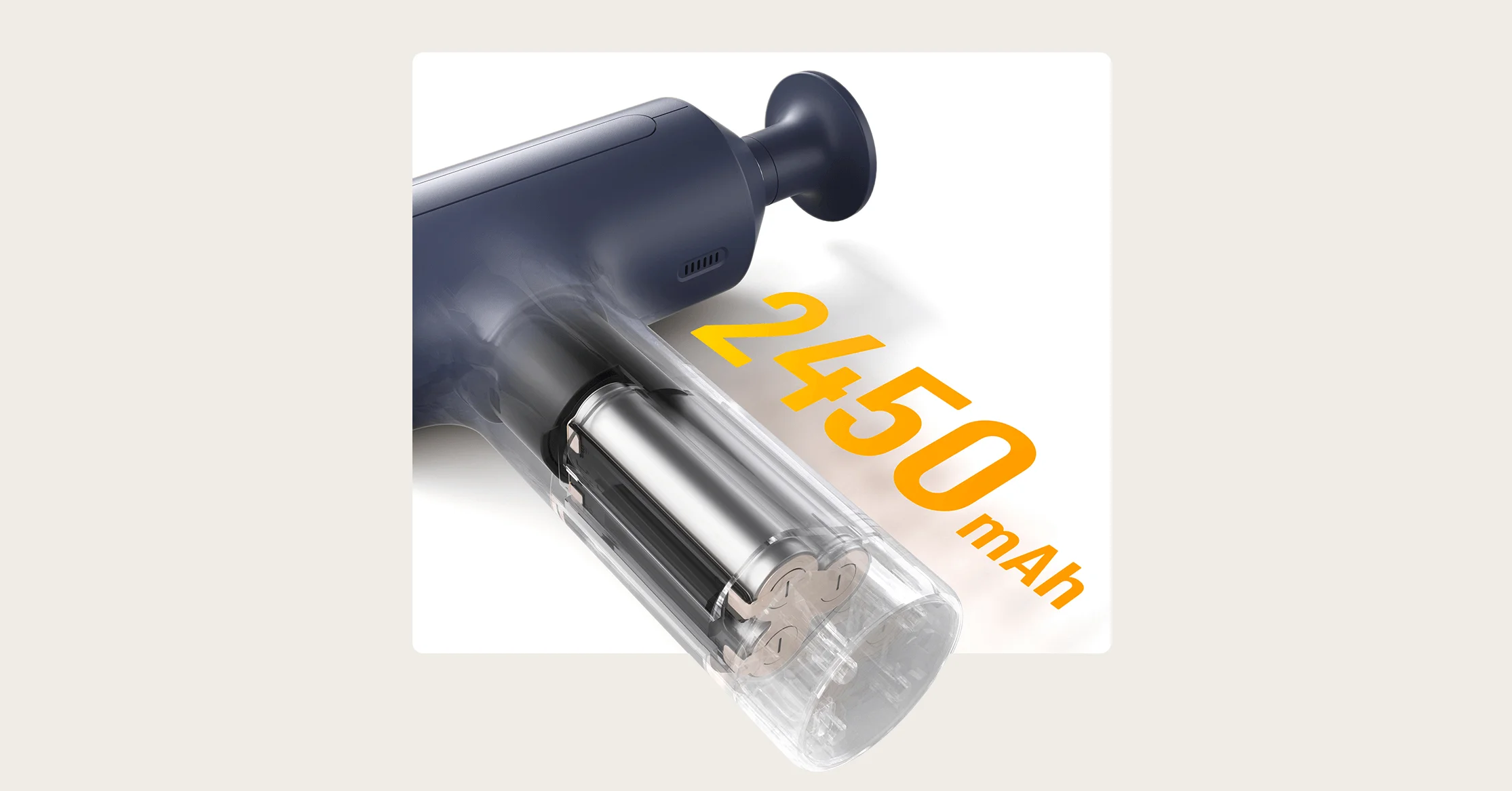 Массажер оснащён аккумулятором ёмкостью 2450 мА·ч, которого хватает до 30 дней умеренного использования или до восьми часов непрерывной работы на минимальной интенсивности. Заряжается устройство через порт USB-C, что удобно для дома, тренировок и поездок. Встроенная система защиты контролирует температуру и предотвращает перегрев во время зарядки.