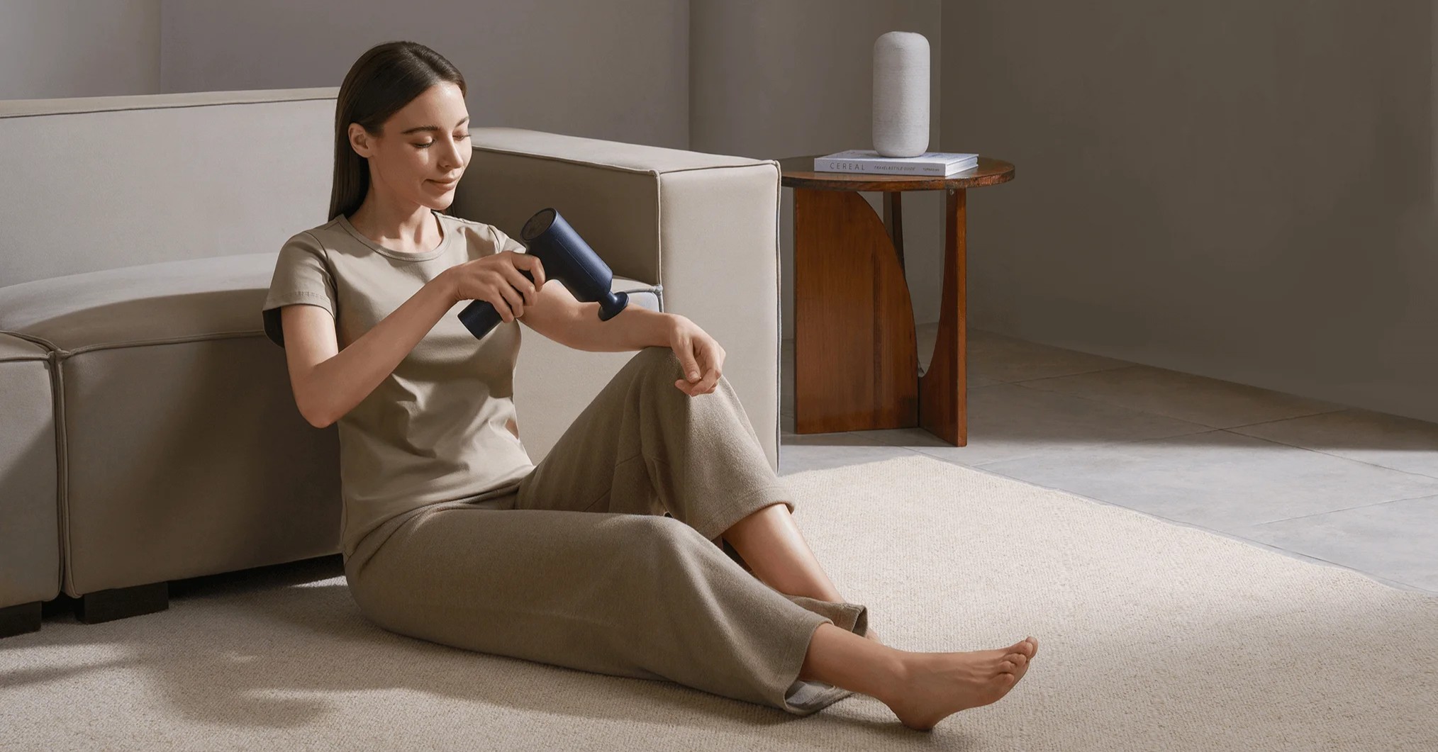Xiaomi Massage Gun 2 выполнен в компактном и аккуратном корпусе из прочного матового пластика, который не скользит в руках и устойчив к появлению следов использования. Вес устройства составляет около 815 граммов, благодаря чему оно ощущается стабильным, но при этом остаётся удобным для длительных сеансов. Эргономичная форма корпуса помогает удерживать массажер под разными углами, не перегружая кисть.