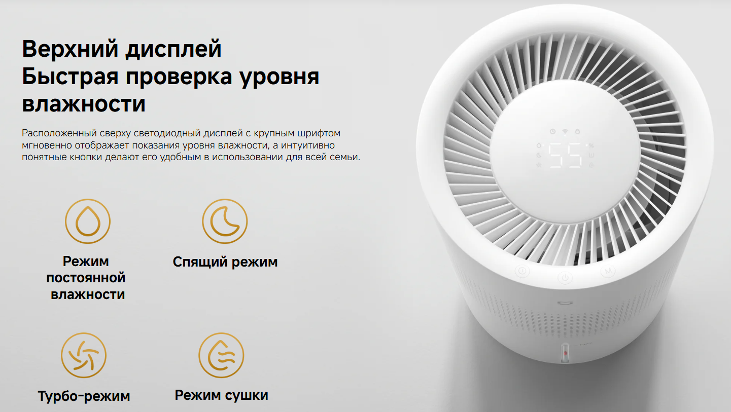 Модель оснащена гигростатом и поддерживает автоматический и ручной режимы работы. Доступно сенсорное и электронное управление, а также контроль через приложение Mi Home и голосового помощника. Есть таймер, регулировка скорости вентилятора и автоматическое отключение при отсутствии воды.