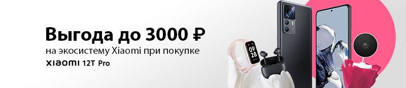 Приобретайте смартфон Xiaomi 12T Pro  и получите скидку на дополнительный товар Xiaomi из представленного списка в заказе. Акция действует с 1 по 31 марта 2023 года.